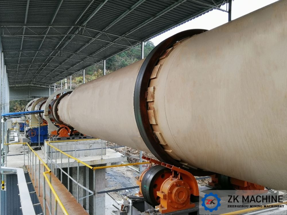 Set up an apron feeder under the hopper. Feed the material into a double shaft mixer. Then the material fall into a double roller granulator to become 5-10mm sphere shape material. And then they are fed to an insert type rotary kiln by belt conveyor.